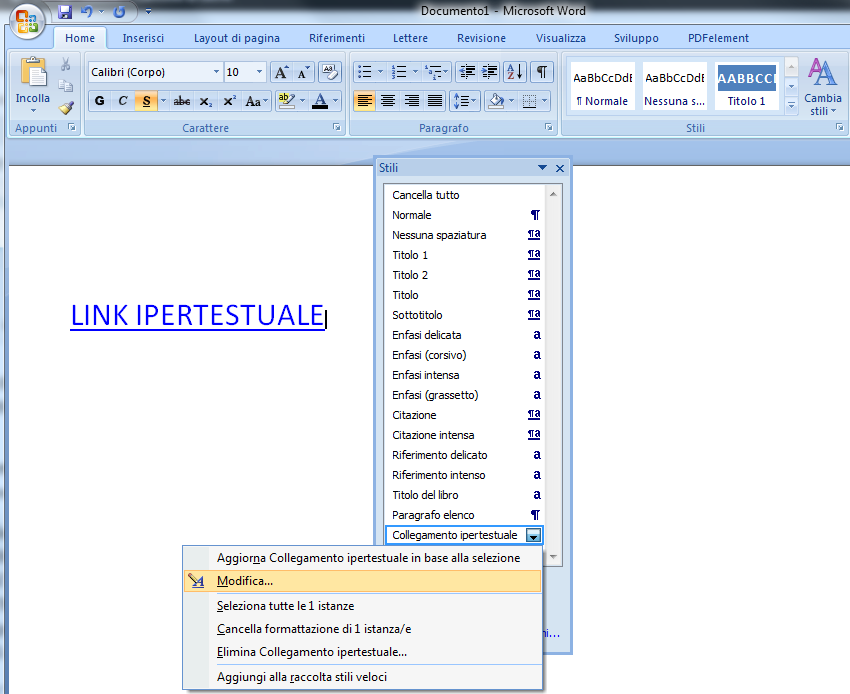 • Nel menu “Stili”, posiziona il puntatore del mouse su “Collegamento ipertestuale”, quindi dal menu a discesa visualizzato, seleziona “Modifica …”.